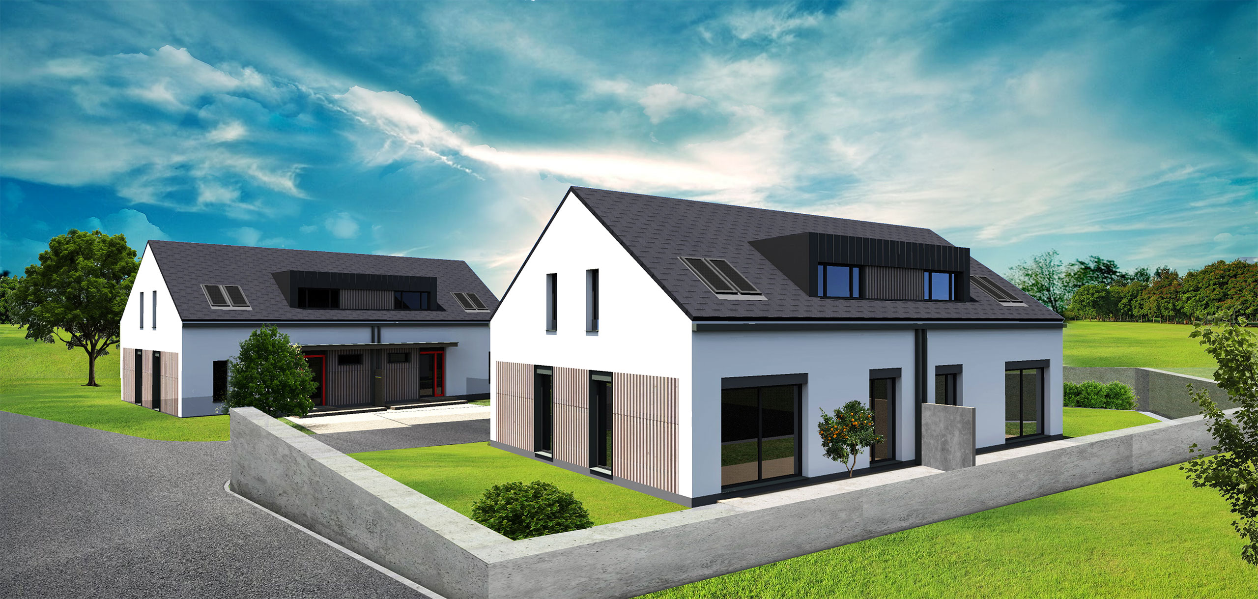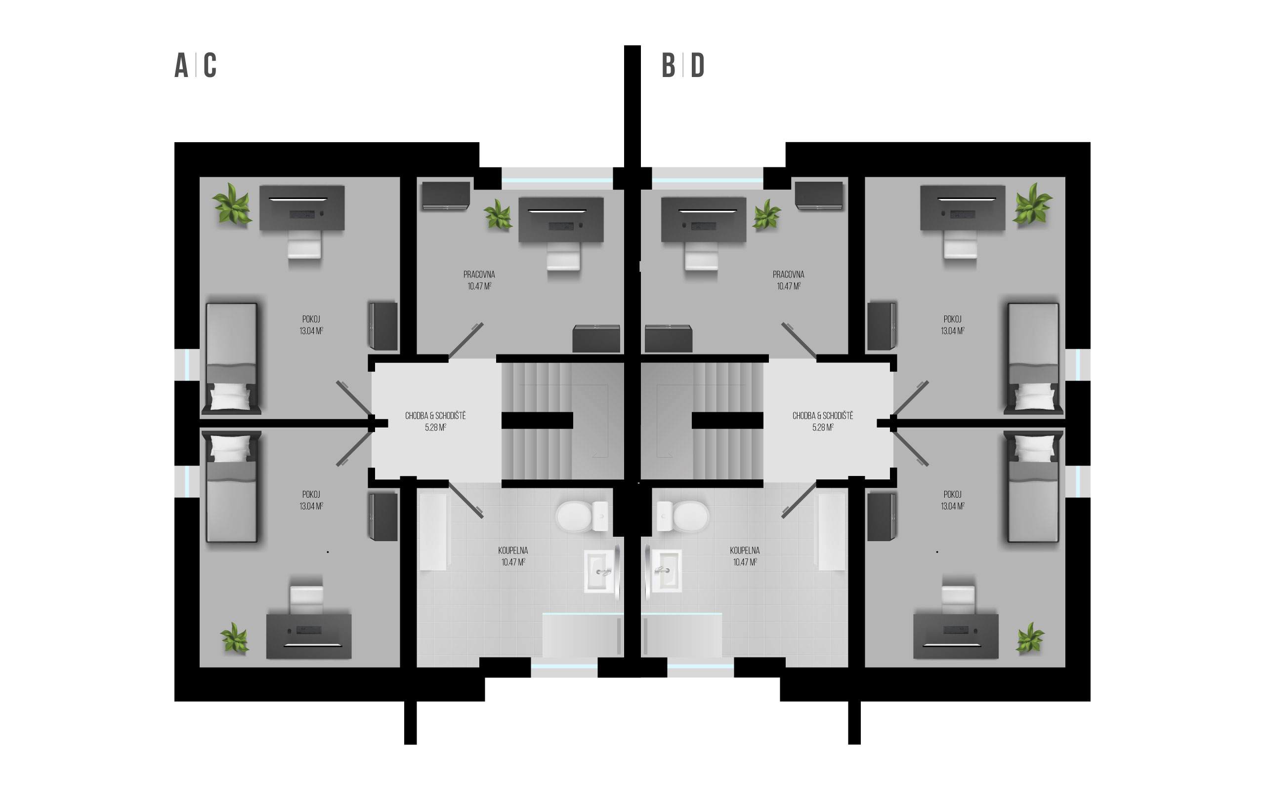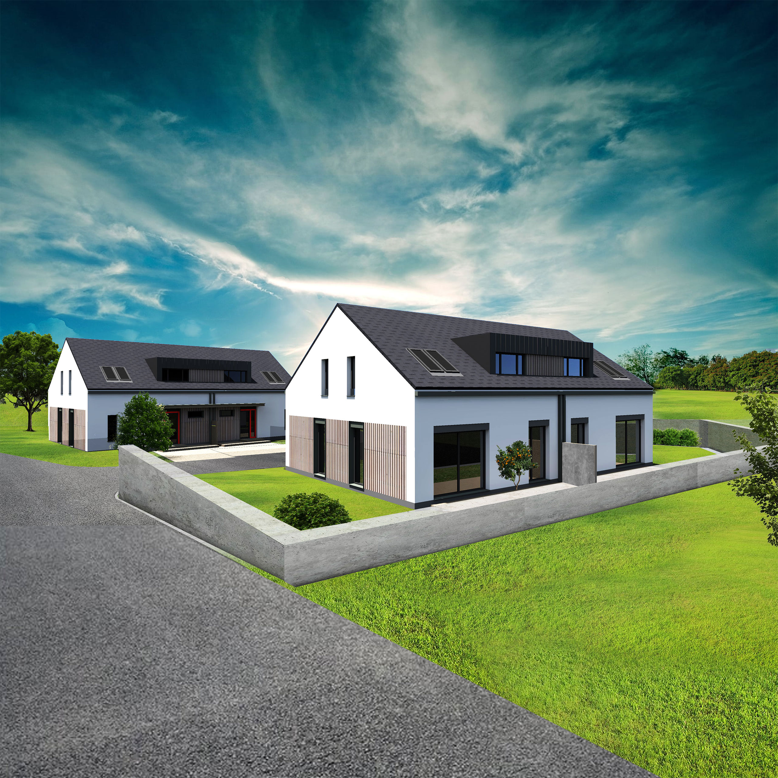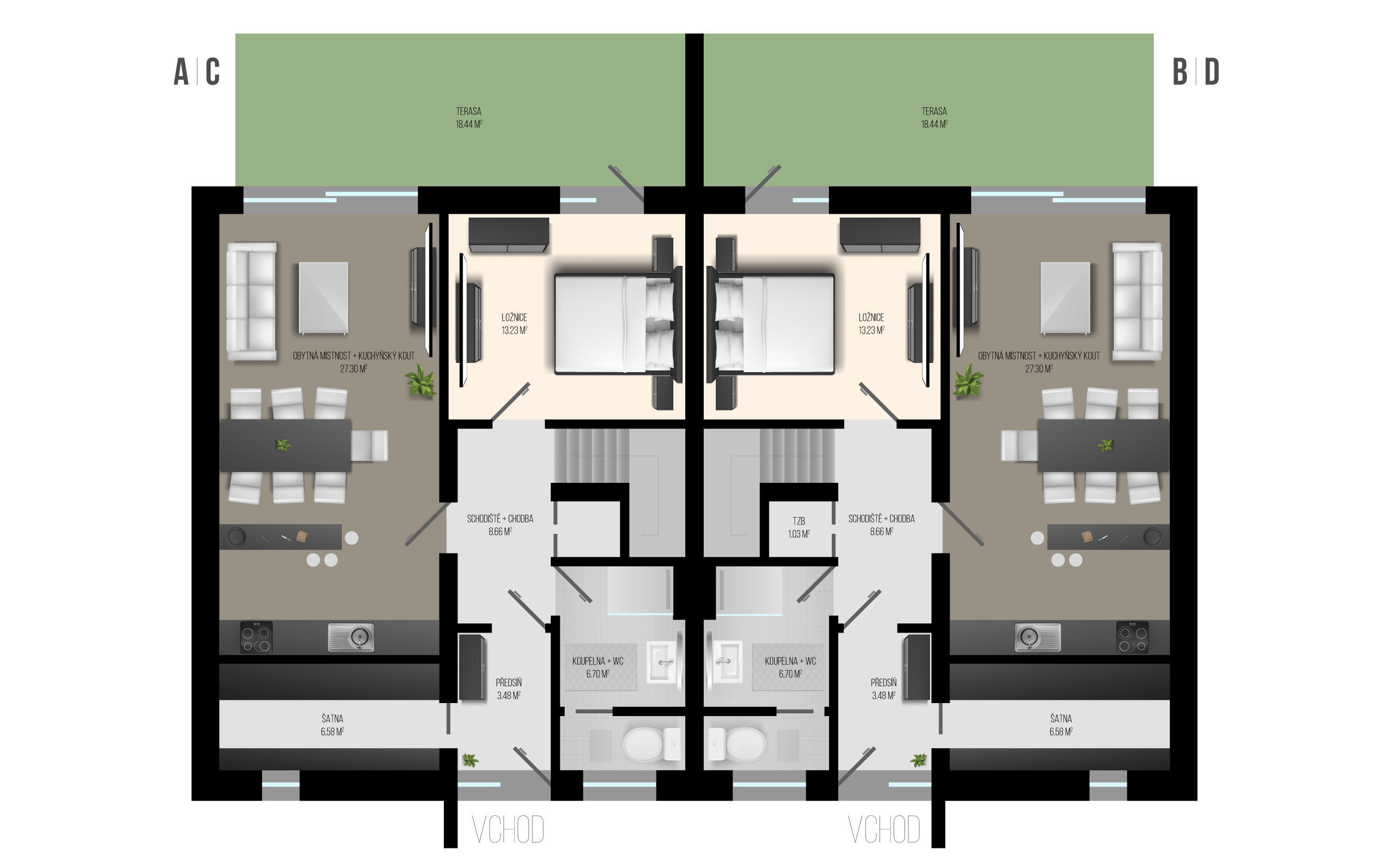 Projekt Jablonné v Podještědí představuje dva dvoupodlažní dvojdomy o dispozici 5+kk s užitnou plochou 120 m2 a zahradou 300 m2.